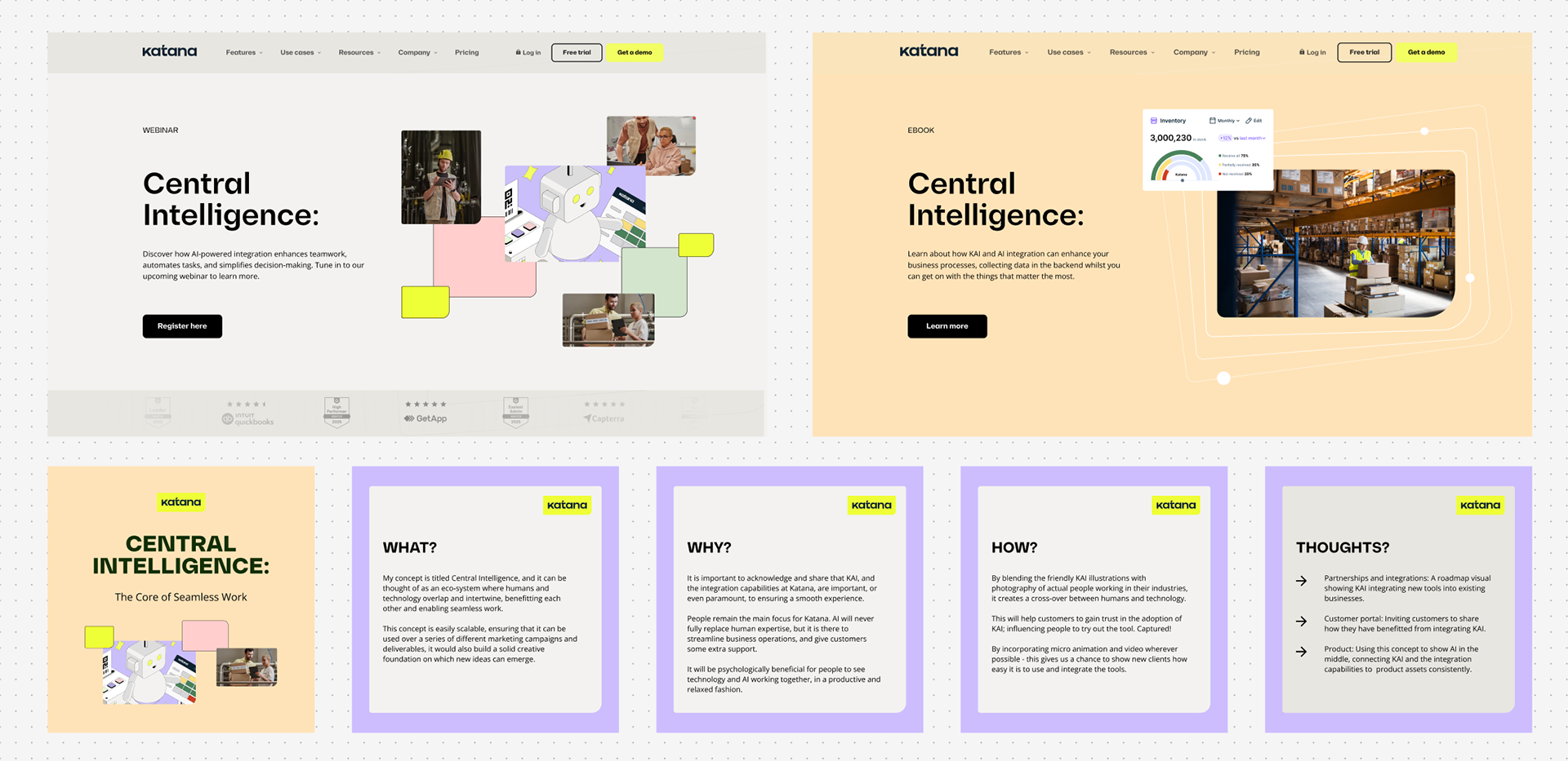 The concept, titled Central Intelligence, explored the relationship between Katana, their AI tool Kai, and the end user. The challenge was low adoption rates for the new feature, with fewer users signing up than expected. Through visual design and illustration, the concept aimed to bridge the gap between user and technology, presenting Kai in a way that felt approachable and trustworthy – ultimately encouraging greater user confidence and adoption.